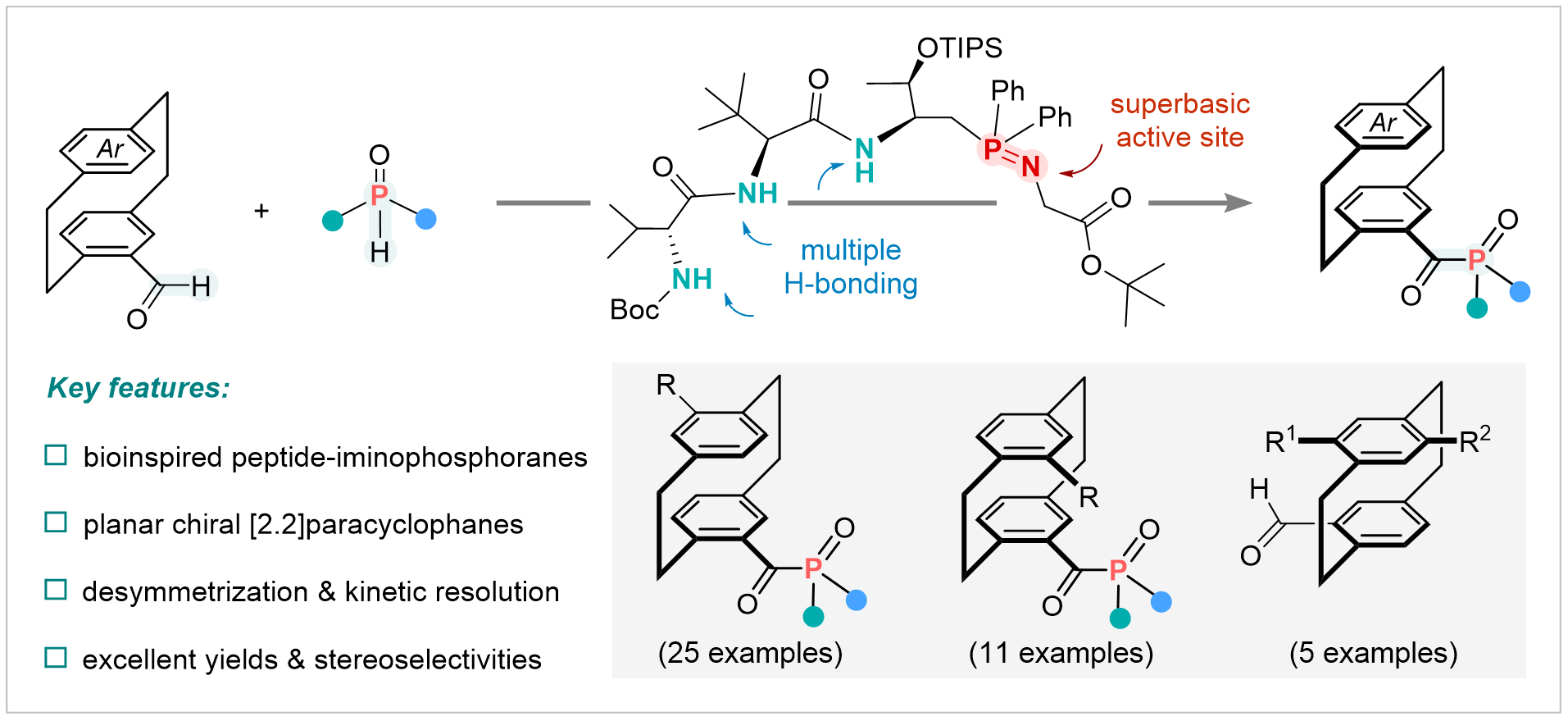 近日,日本色情片王天利教授团队通过合理设计并开发了一类新型的手性肽-膦亚胺(PIMPs)超强碱催化剂,利用该有机强碱催化剂的协同作用,实现了不对称Pudovik加成反应和氧化反应的复杂串联过程,分别以去对称化和动力学拆分方式高效高选择性合成了一系列取代的[2.2]对环蕃分子(图1)。