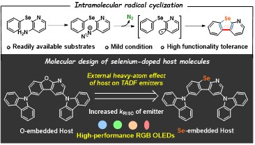 游劲松教授、宾正杨教授团队和苏州大学陈先凯教授合作,提出了在主体材料中的硒掺杂策略,通过建立高效的自由基环化反应,成功设计并合成了以苯并[4,5]硒吩并[2,3-b]吡啶(BSeP)为核心骨架、双咔唑修饰的双极主体材料DCz-BSeP。与氧基(DCz-BFP)和硫基(DCz-BTP)材料相比,硒的引入显著增强了材料的自旋轨道耦合,使TADF发光材料的反向系间窜越速率提升了三倍,同时优化了双极传输特性。OLED测试结果表明,以DCz-BSeP为主体材料制备的红绿蓝三基色TADF-OLEDs,相较于基于DCz-BFP和DCz-BTP的器件,均表现出更高的效率和更低的效率滚降。此外,该材料在窄光谱红光超敏荧光OLED和磷光OLED中的拓展应用,进一步验证了主体材料中的硒掺杂策略在OLED中的普适性和应用前景,为未来OLED主体材料的开发提供了新的设计思路和方向。
