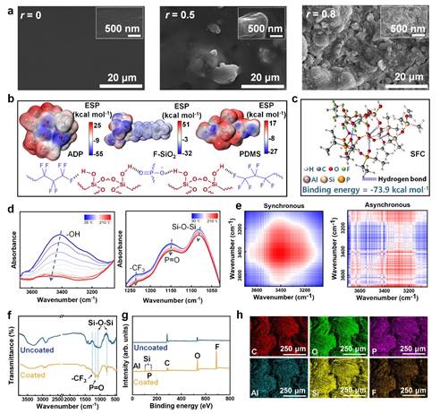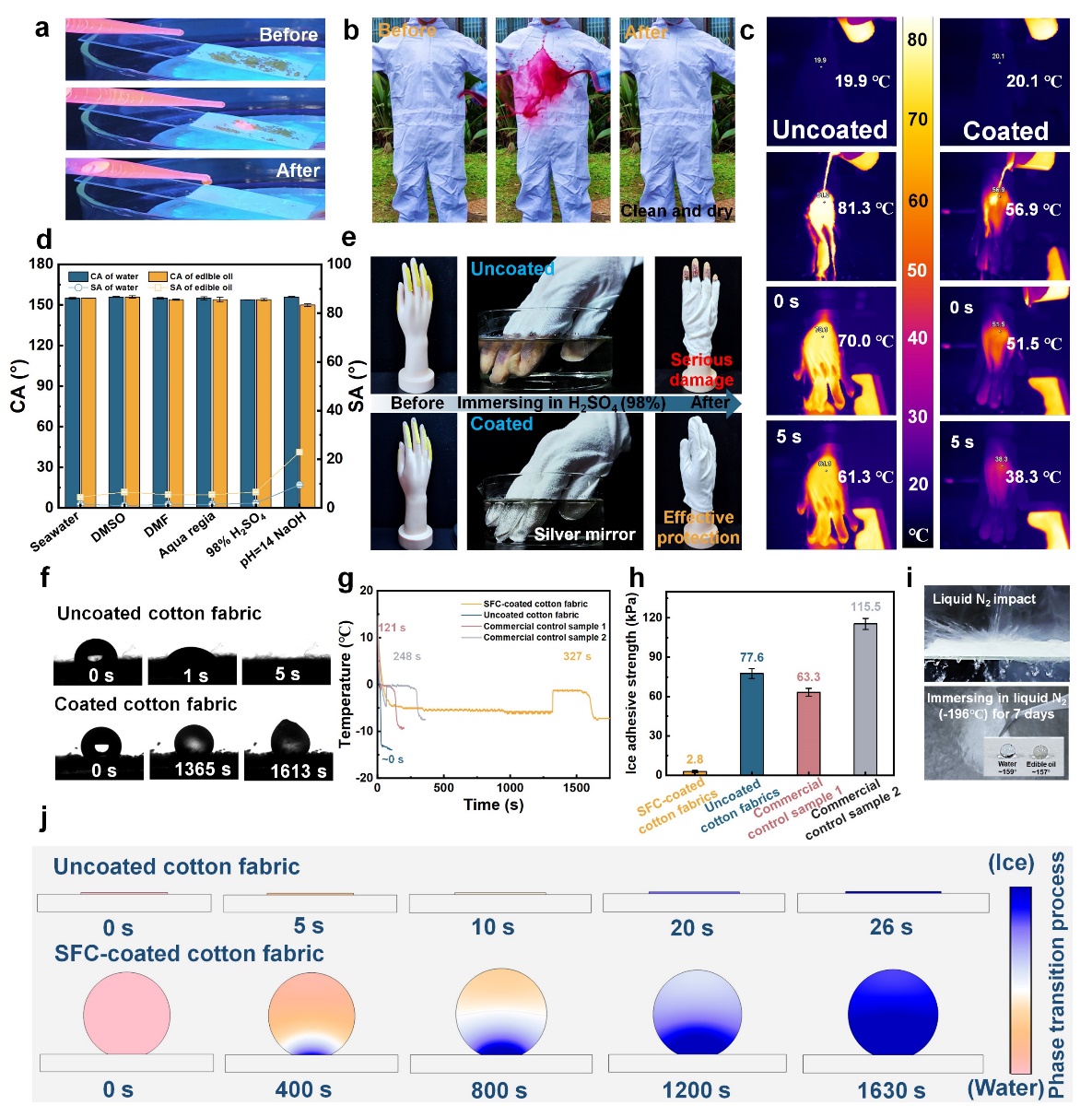 结合分子静电势图、构象搜索及温度依赖傅里叶红外和二维红外谱图,证实了涂层中多种氢键的存在(图2),显著提升了涂层与基材的界面结合强度及抗变形性能,同时实现了空气防护层的稳定捕获。稳定的空气层赋予涂层极低的水粘附力(0.002 mN),并展现出优异的防污性(图3)、热液体排斥性(100 ℃)、低温耐受性(-196 ℃)及耐化学腐蚀性(甚至可抵抗王水和浓硫酸)(图4)。