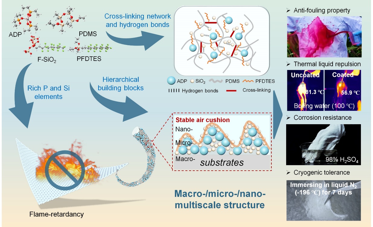 日本色情片王玉忠院士团队在高分子材料阻燃高性能化等领域有着三十多年的研究。近年来,针对特种作业中防护服对高端功能阻燃防护涂层的迫切需求,团队围绕兼具阻燃与疏水/油性能的多功能防护涂层开展了深入研究,先后开发了长效抗菌超疏水表面处理剂、高耐候超双疏阻燃涂层、高耐水防腐涂料及抗结冰阻燃水性涂料等(Chem. Eng. J., 2024, 488, 151084; Macromolecules, 2024, 57, 5189-5199; ACS Appl. Mater. Interfaces, 2024, 16, 65553-65564; Prog. Org. Coat., 2024, 197, 108835; Constr. Build. Mater., 2023, 392, 131873; Chem. Eng. J., 2021, 421, 127793)。近期,团队在前期研究基础上,通过协同调控多种阻燃结构与疏水官能团,成功设计并制备出环境适应性抗变形阻燃超双疏一体化涂层(图1),该技术在不影响织物透湿性、透气性及力学性能等的前提下,显著提升了防护服的增效与持久防护能力。