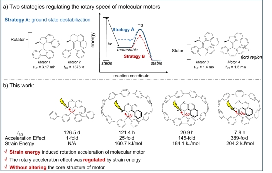 成楚旸教授团队,华南师范大学陈家文教授团队和南方科技大学余沛源教授团队合作,通过将基于大位阻烯烃的光驱动分子马达嵌入环对苯撑这类张力大环里,成功实现了张力诱导的分子马达的旋转加速。此外,通过调节环对苯撑的尺寸调控环张力,实现了分子马达旋转的分级加速,其最大加速效应可达389倍。