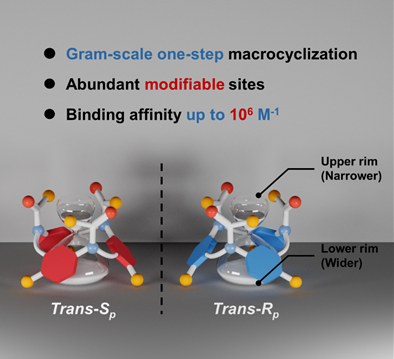 杨成教授,伍晚花教授和余志鹏教授合作,有廉价易得的非那西丁出发,合成了一种基于Mannich型缩合反应的非那西丁[3]芳烃(Phenacetin[3]arenes,简称Ph[3])的一锅法高效合成方法,建立了亚甲基连接芳胺和芳香碳(NAm-CH₂-CAr)的全新环化路径。由此合成的Ph[3]展现出独特沙漏状结构,双端开口具备丰富的化学修饰性,并在客体作用下展现出有趣的变构调节行为。