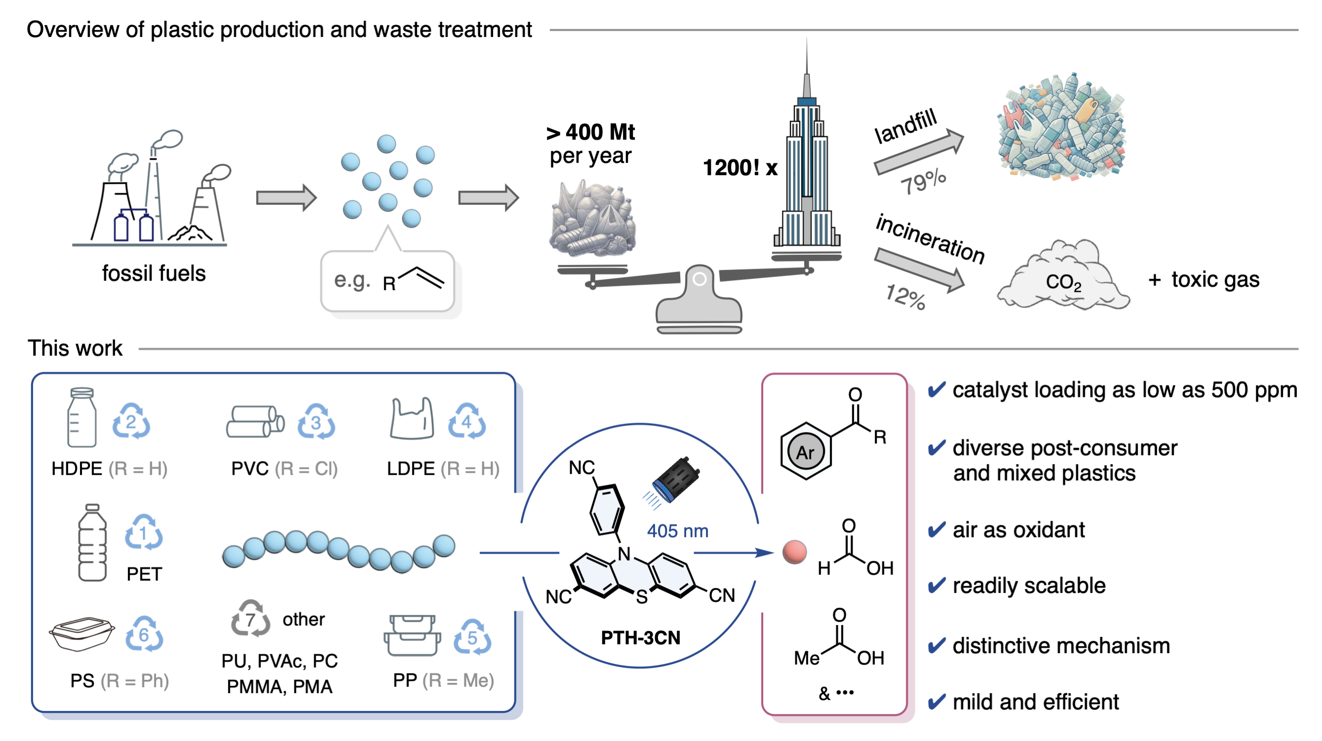 肖啸课题组提出了一种基于吩噻嗪衍生物(PTH-3CN)的多功能有机光催化升级回收策略。该方法能够在温和条件下实现高效降解多种常见商业塑料,包括聚对苯二甲酸乙二醇酯(PET)、聚乙烯(PE)、聚丙烯(PP)、聚苯乙烯(PS)、聚氯乙烯(PVC)、聚氨酯(PU)和聚碳酸酯(PC)等。