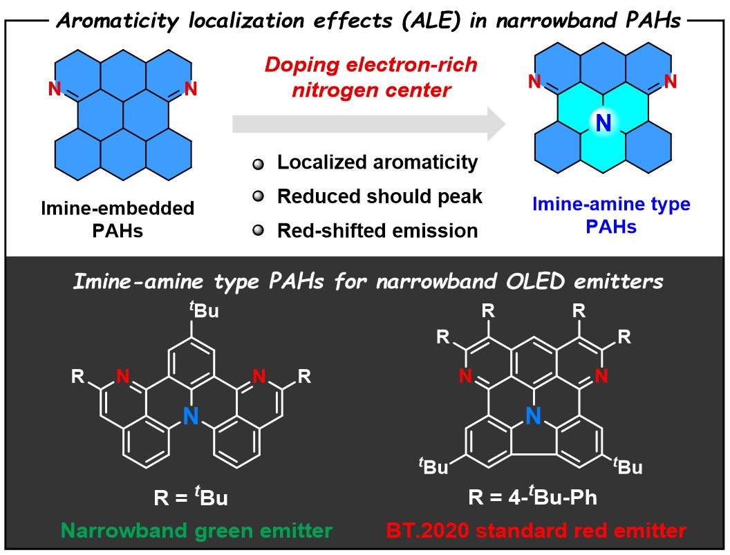 游劲松教授与宾正杨教授团队在多环芳烃窄光谱荧光材料领域取得重要突破,提出了"芳香性定域效应"(Aromaticity Localization Effects, ALE)这一全新概念,为窄光谱OLED发光材料的设计开发提供了突破性的理论指导。通过系统的理论计算和实验验证,作者证明了多环芳烃分子的芳香性与其发光光谱性质存在显著相关性。具体而言,通过调控多环芳烃分子的芳香性,可有效抑制发光光谱中的肩峰强度,从而实现高色纯度的窄光谱发射,这一发现被定义为"芳香性定域效应"。基于这一理论,通过在团队前期开发的亚胺嵌入的稠杂多环芳烃体系(J. Am. Chem. Soc. 2024, 146, 15977)引入富电子三芳胺氮原子,他们成功构建了独特的"亚胺-苯胺型"多重共振体系。这一分子设计具有以下优势:一方面,通过不同电性氮原子间的多重共振作用,实现了前线分子轨道在氮原子及芳环骨架上的局域化分布,从而在发光中心实现芳香性定域现象,使发光半峰宽得到显著降低;另一方面,三芳胺氮原子的引入增强了分子内的短程电荷转移性质,实现了显著的发光红移,有效解决了传统硼氮共振体系在实现红光发射方面的关键技术瓶颈。基于以上分子设计策略,团队成功开发出一系列窄光谱发光材料,涵盖绿光、黄光至深红光波段。特别值得关注的是,具有芳香性定域特征的II-b化合物表现出优异的深红光发射特性:其最大发射波长达到660 nm,半峰宽仅为35 nm(0.10 eV)。此外,基于II-b的OLED器件实现了符合BT.2020标准的深红光发射,CIE色坐标达到[0.71, 0.29]。这一突破性进展不仅验证了芳香性定域效应的科学价值,更为发展下一代广色域OLED高清显示技术提供了重要的材料基础和技术路径。