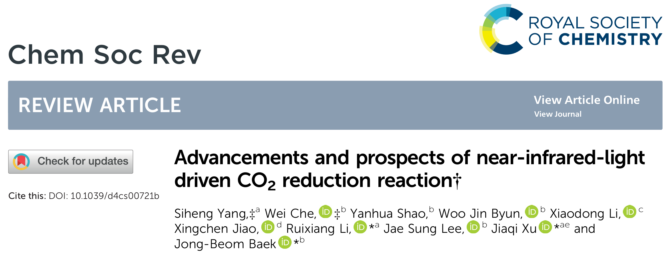 李瑞祥教授/徐嘉麒副研究员(专职科研)等人在国际顶尖期刊《Chemical Society Review》上发表了题为“Advancements and prospects of near-infrared-light driven CO2 reduction reaction”的综述论文,系统地阐述了近年来在近红外光驱动的二氧化碳转化领域的重要进展,并展望了未来研究方向。