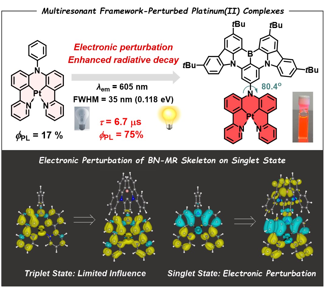 游劲松教授团队的宾正杨教授、高戈教授与苏州大学陈先凯教授合作,提出了一种利用硼氮骨架对金属铂配合物进行微扰以增强磷光的策略,成功构筑了新型高效窄光谱红光发光材料体系。研究发现,将硼氮骨架与弱发光的铂配合物进行正交结合,可以在基本维持磷光三线态发光波长和半峰宽的前提下,硼氮骨架的单线态强辐射跃迁可有效增强磷光跃迁偶极矩,从而显著提升发光效率。该工作不仅开发了一类新型高效的窄光谱红光磷光材料体系,更揭示了一种基于硼氮骨架与铂配合物微扰的发光增强机制,为发展高性能窄光谱磷光材料提供了新思路。