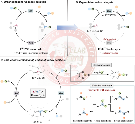 董召文课题组聚焦于具有准金属特性的低价重十四族元素试剂的精准合成与催化性能研究。围绕“低价锗、锡试剂的高效创制与功能调控”这一关键科学问题,课题组通过创新配体设计与合成策略,成功开发了多种结构新颖的低价锗、锡试剂,并率先构建了基于Ge(II)/Ge(IV)、Ge(II)/Ge(III)/Ge(IV)及Sn(II)/Sn(IV)变价循环的主族催化新体系,实现了惰性化学键的高效活化与精准转化(J. Am. Chem. Soc. 2025, doi.org/10.1021/jacs.5c12407; Nat. Commun. 2024, 15, 9849; JACS Au 2025, 5, 1289)。然而,EII/EIVO(E = Ge, Sn)催化体系的构建及其在变价催化中的应用迄今仍未实现突破,仍是该领域亟待解决的重要科学挑战。