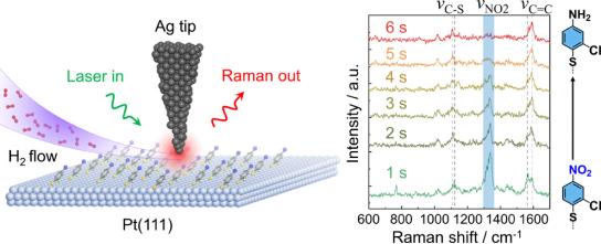 (ETH Zürich)的Naresh Kumar研究员与Jeremy O. Richardson教授合作,利用针尖增强拉曼光谱技术(Tip-enhanced Raman spectroscopy, TERS),结合模型表面体系与密度泛函理论(DFT)计算,成功实现了在Pt(111)单晶表面上分子氢活化及其驱动的卤代硝基苯硫酚(CNTP)选择性氢化反应的纳米级实时追踪。研究在单个纳米反应区间内(探测体积内分子数少于100个)直接观测到动态反应的特征振动演化过程,并在分子层面揭示了金属表面催化氢化的动力学过程。