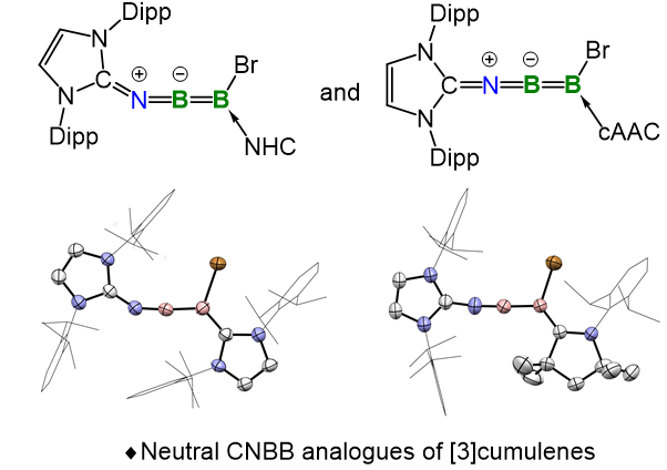 卢伟课题组长期致力于主族元素新化合物(s区和p区元素),特别是低价态和低配位数主族元素化合物的合成、结构、成键,以及它们在小分子活化和转移,复杂化合物构建和催化反应中的机理和应用研究。近日,该课题组将路易斯碱稳定B−B多重键的化学方法扩展至构建含B−B不饱和键的杂原子累积多烯中,报道了两种中性杂累积多烯的合成、表征及反应性,其显著特征是基于不对称B(sp)=B(sp⟡)单元构建的CNBB骨架。值得注意的是,通过改变配体的π-受体能力,可以调控这些累积多烯的几何构型。X射线衍射分析显示,由N-杂环卡宾(NHC)支撑的累积多烯呈现弯曲构型,而由具有更强π-酸性的(环状)(烷基)(氨基)卡宾(cAAC)稳定的累积多烯则呈现近乎线性的构型。并通过理论计算进一步验证了这两种情况下,CNBB骨架均具有强烈的累积多烯特征。