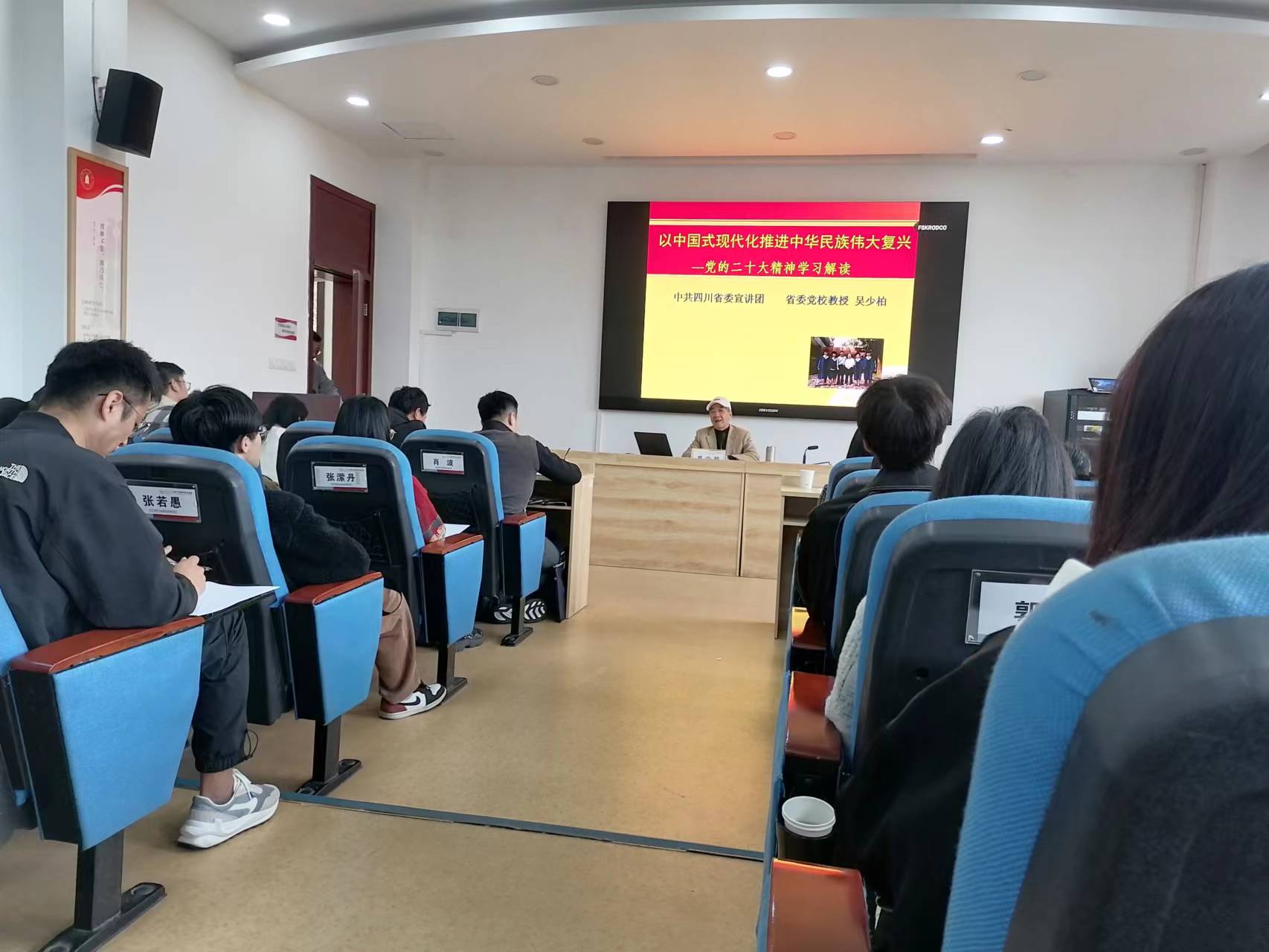 吴少柏教授,作《迈步新征程,奋力建设现代化强国,推进中华民族伟大复兴——党的二十大精神学习》专题讲座。吴教授从民族复兴的伟大进程、“两个确立”的决定性意义、“三个务必”的丰富内涵、中国式现代化的内容等方面对党的二十大精神进行了深刻全面的解读。