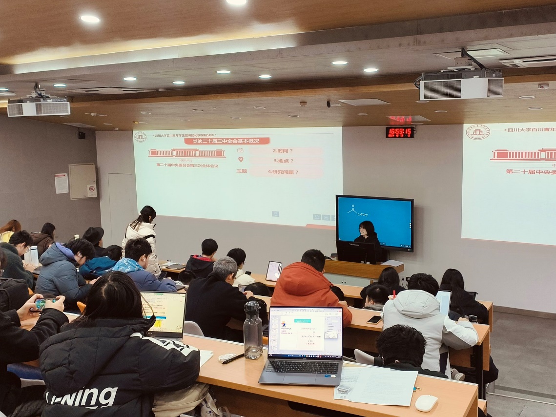 首先,主讲的孙宇琪和辛淳同学通过问答互动,与现场同学一起回顾了党的二十届三中全会基本概况,并指出会议强调当前和今后一个时期是以中国式现代化全面推进强国建设、民族复兴伟业的关键时期,并向同学们提供了自主学习会议精神的相关方式。