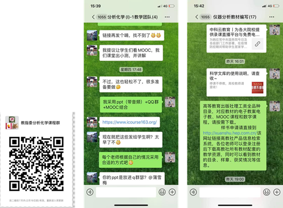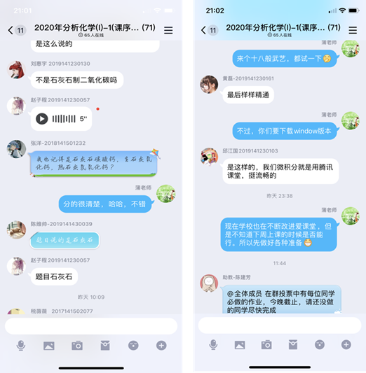 蒲雪梅老师发动课程教学团队集智聚力,探索和制定线上教学方式,多种渠道收集线上教学资源(电子教材、MOOC等),并根据课程内容和特点筛选出适合学生的教学材料。为预防正式上课时网络拥堵对直播教学的影响,准备了爱课堂、腾讯课堂和QQ群等多种线上教学方式的结合。此外还制作了融入音频讲解和动画演示的课件,并把课件、电子教材以及其他线上教学资源提前放发到班级QQ群中,让同学们可以提前预习和错峰学习。分析化学教学团队通过布置详细的学习任务、及时提供学习资源(随学习进度不断补充)、在线互动问答的形式,为学生打造了全天候的在线学习平台。